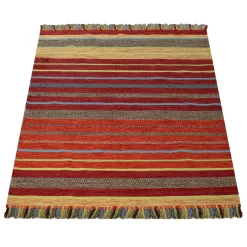 Wenn Sie mit Ihrer Einrichtung absolut im Trend liegen wollen, kommen Sie an einem Kelim nicht vorbei. Natürliches Material und individuelles Design vereinen sich bei diesen Teppichen zu einem Gesamtkunstwerk, das jede Wohnung schmückt. Die Webteppiche überzeugen durch liebevolle Details wie geflochtene Umrandungen und effektvolle Fransen. Modern ist auch die Farbgestaltung der unterschiedlichen Modelle. Neben dezenten Kelims in Grau und Braun gibt es farbenfrohe Varianten in Rot, Türkis, Grün und Lila oder gleich im kunterbunten Farbmix. Ob Sie sich für einen melierten Webteppich oder einen mehrfarbigen Kelim mit Muster entscheiden, hängt ganz von Ihrem persönlichen Geschmack ab. Alle Kelim Teppiche der Kilim TD Kollektion sind handgewebt und bestehen aus 100 % Baumwolle. Die strapazierfähige Naturfaser hat einen sehr angenehmen Griff, ist pflegeleicht und bleibt lange schön. So einfach kann Wohlfühlen sein!