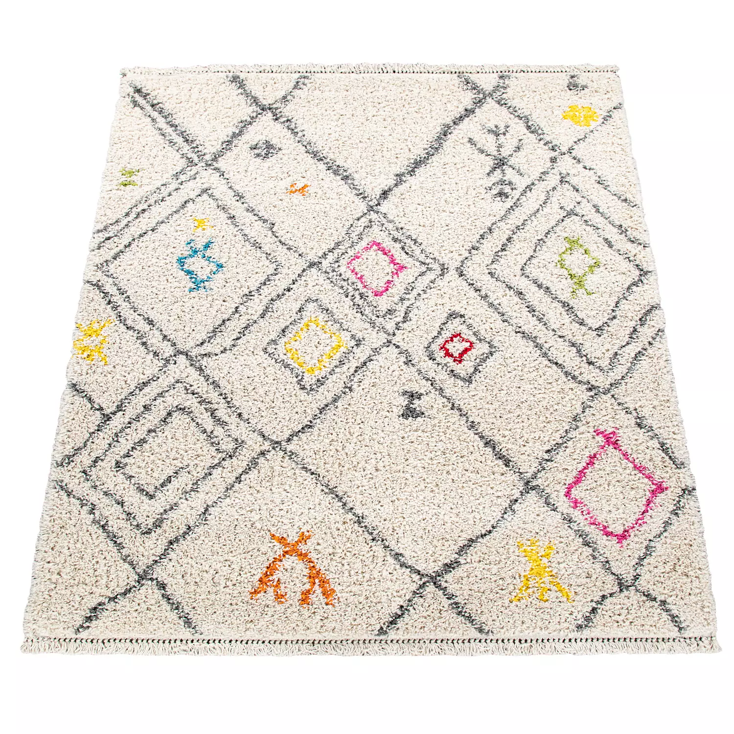 Ethno-Look mal anders! Der angesagte Stil trifft hier auf eine wundervoll flauschige Oberfläche in Form dieser bezaubernden Teppiche. Kreieren Sie mühelos eine gemütliche Wohlfühl-Oase in Ihren eigenen vier Wänden und lassen sich vom exotischen Flair des Ethno-Designs mitreißen. Der warme Beigeton macht sich dabei perfekt als Untergrund und fügt sich gekonnt in jedes bereits bestehende Mobiliar ein, während das unregelmäßige, bunte Rauten-Muster für das gewisse Etwas sorgt und den schönen Shaggys ihren besonderen Charme verleiht.
