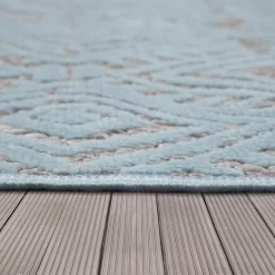 Für eine extravagante Note auf Ihrem Balkon oder Ihrer Terrasse: Zeitlos und vornehm zaubern diese kunstvollen In- und Outdoor-Teppiche mit stilvollem Design und subtilen Farben schlichte Eleganz auf Ihren Boden. Farblich halten sich die noblen Wohnkunstwerke hierbei bewusst zurück und fügen sich in dunklem Grau und Türkis unaufdringlich und gekonnt in Ihren Außenbereich ein und werten diesen elegant auf. Einzig der durch hochwertiges Cut-Loop-Verfahren hervorgehobene 3-D-Effekt und das zurückhaltende Ethno-Muster verhindern, dass die Teppiche zwischen Gartenmöbeln und Topfpflanzen untergehen und machen sie zu zurückhaltenden Meisterwerken.