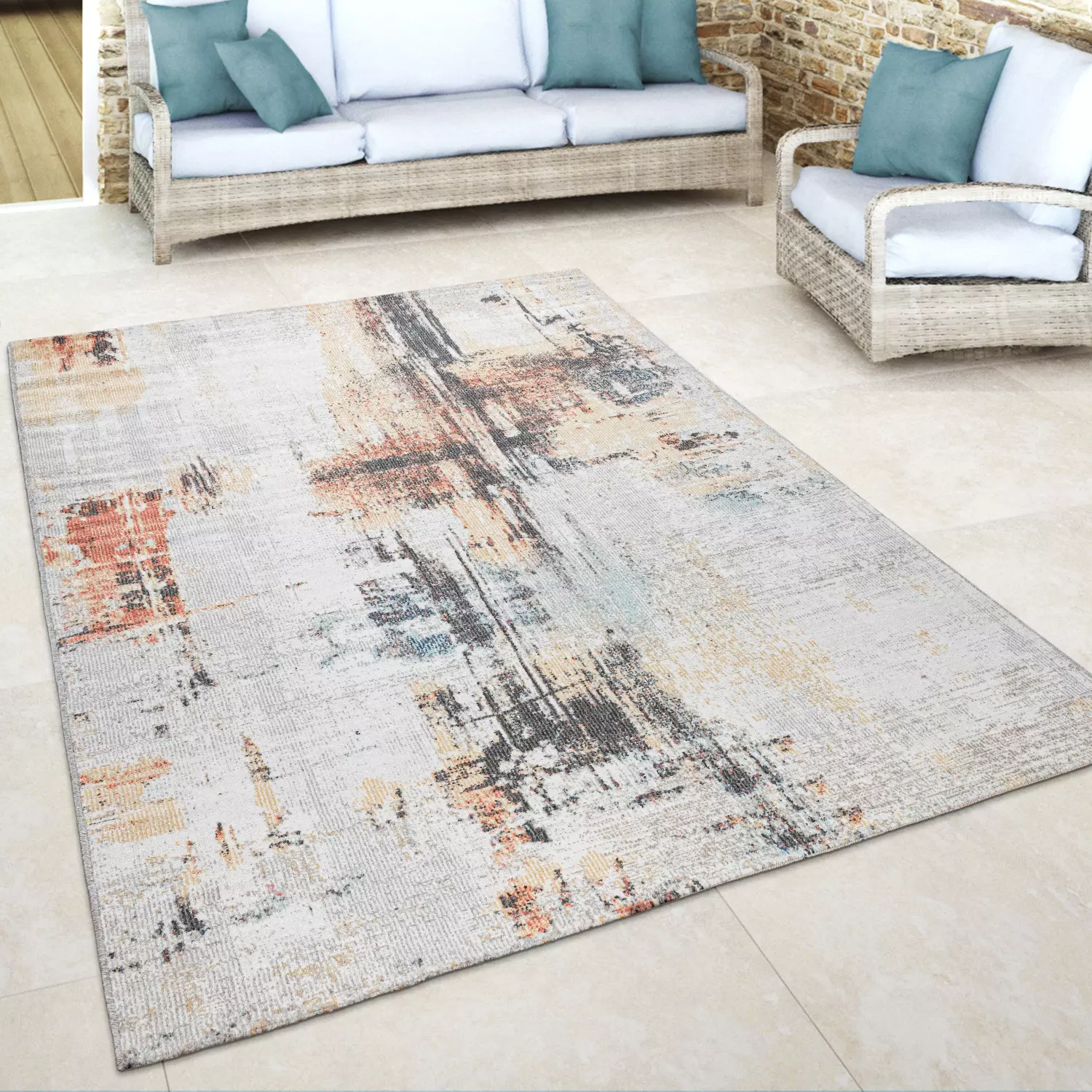 Für ein ganz besonderes Flair auf Ihrer Terrasse oder Ihrem Balkon: Diese stylishen Outdoor-Teppiche verwandeln Ihren Außenbereich im Handumdrehen in ein zweites Wohnzimmer mit modernem Ambiente. Mit ihrem Ãußeren erinnern sie an abstrakte Gemälde – zeitlose Meisterwerke die wahrlich jeden Boden bereichern. Als stilvolles Extra wird das auffällige Design vom modischen Used-Look kunstvoll abgerundet, was die Fußschmeichler zu vielseitigen Alleskönnern macht. Genießen Sie die warmen Monate in einer zauberhaften Umgebung.
