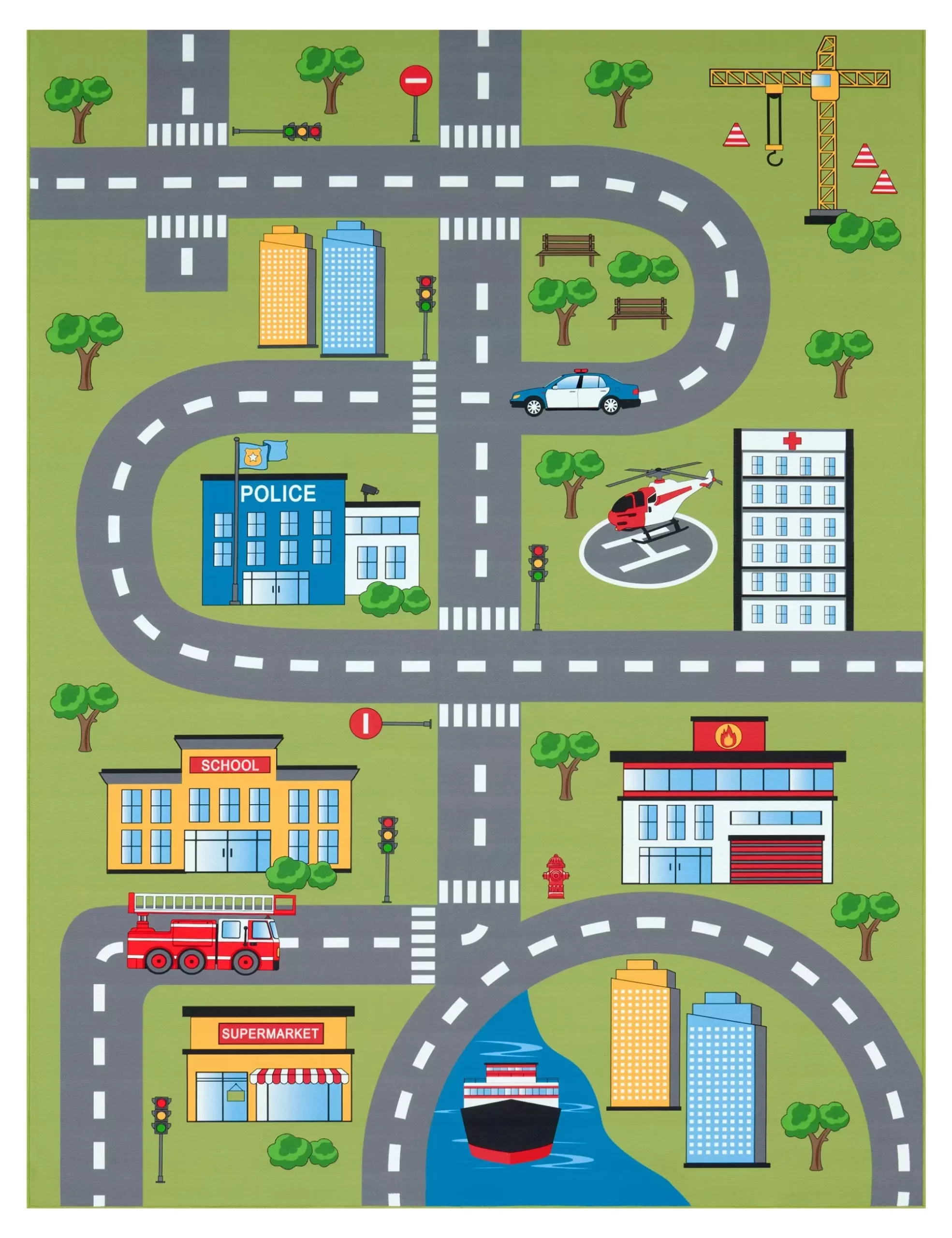 Der Klassiker im Kinderzimmer: Jeder kennt sie und jeder hat sie geliebt – die klassischen Kinder-Teppiche mit Straßen-Motiv. Auf diesen fantasievollen Straßen können Ihre Kinder an der Seite von der Polizei oder der Feuerwehr die tolle Stadt erkunden und stoßen auf den detailverliebten Teppichen ständig auf etwas aufregendes Neues. So geht die spannende Reise vorbei an einem großen See mit Kreuzfahrtschiff, vorbei an der Schule, einem Krankenhaus und wenn das Auto nicht mehr reichen sollte, bietet der Hubschrauber-Landeplatz die ideale Möglichkeit auch luftige Höhen zu entdecken. Dank der neutralen Farbgebung in Grün kommen die Teppiche bei Jungen und Mädchen gleichermaßen gut an und sind damit der absolute Hit im Zimmer Ihrer Kleinen.