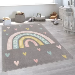 Die Herzchen auf diesen wunderschönen Teppichen spiegeln genau das wider, was wir denken, wenn man das zuckersüße Regenbogen-Motiv in der Mitte der Kurzflore anschaut. Aber nicht auf unseren Geschmack kommt es hier an, sondern auf Ihren oder vielleicht sogar noch etwas mehr auf den Ihrer Kinder. Wir glauben jedoch, dass kein kleines Mädchen den liebevoll gestalteten Designs und den zarten Farben wie Pink, Grau, Beige oder Creme widerstehen kann und sind uns sicher, dass die Teppiche die perfekte Spielunterlage in jedem Kinderzimmer sind.