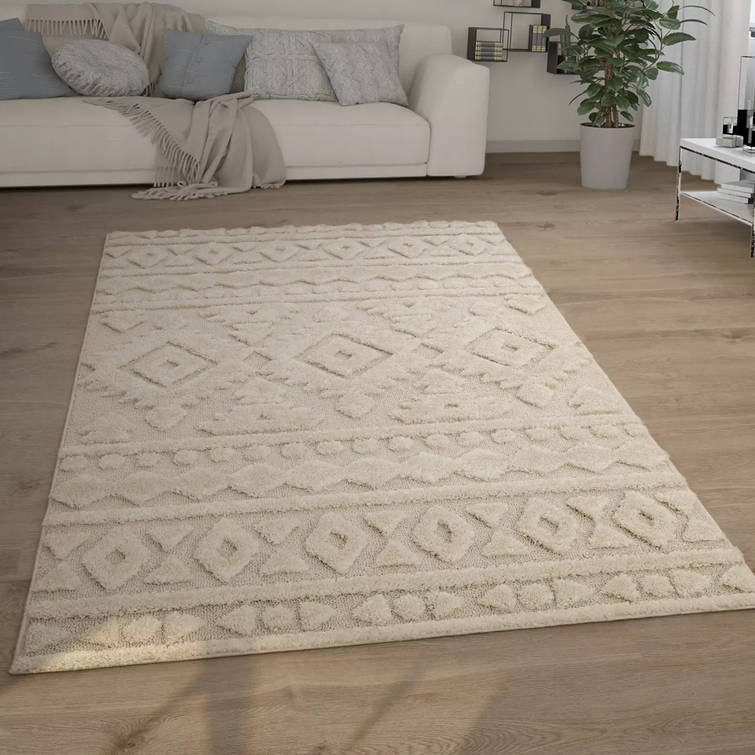 Der angesagte und beleibte Skandi-Stil macht selbst aus bitterkalten Polarnächten gemütliche Kuschelabende und mit diesen trendigen Hochflor-Teppichen sind Sie mittendrin. Die unaufdringlichen Beigetöne und das schlichte Rautenmuster im Ethno-Stil lassen sich problemlos mit unterschiedlichen Einrichtungsstilen kombinieren und sorgen in jeder Umgebung für heimelige Atmosphäre und ein nordisch gemütliches Flair. Aber nicht nur optisch sind diese Wohnaccessoires echte Highlights, denn sie wissen auch mit ihrem kuschelweichen Flor zu überzeugen, der Ihnen ein einmaliges Laufgefühl beschert.