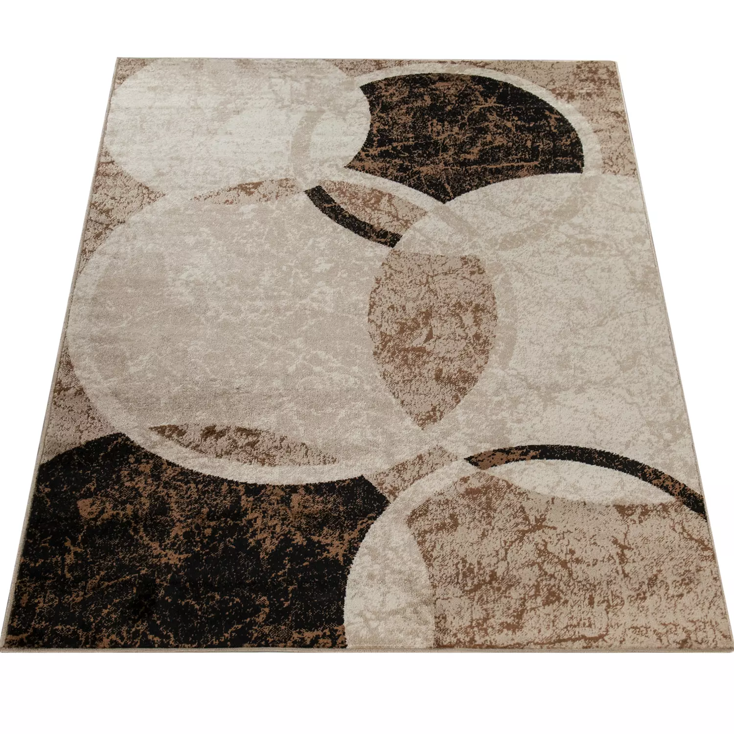 Wie aus dem antiken Rom entsprungen wirkt dieser Teppich durch seine herrliche Marmorierung und besitzt dennoch einen höchst modernen Charakter. Seine neutrale Farbgebung in Schwarz, Weiß und Grau wirkt seriös, ohne an Behaglichkeit zu verlieren. Die großen Kreiselemente scheinen wie übereinander gelegt – dieses Accessoire ist ein echtes Prachtstück für Ihre Wohnlandschaft! Ein Teppich, der in vielen Eigenschaften punktet: So ist er durch sein hochwertiges Material sehr robust und schmutzabweisend. Selbstverständlich lässt er sich auch auf Fußbodenheizungen einsetzen. Mit einer Höhe von circa 8 Millimetern ist sein Flor sehr dicht und damit vor allem eines, nämlich wunderbar weich. Einrichtungs-Tipp: Auf dunklem wie hellem Untergrund kommt dieser Teppich gleichermaßen zur Geltung. Die modern-kühle Farbgebung wird durch warme Farben bei Möbeln, Vorhängen oder Kissen ebenso gemildert wie durch ein schönes, durchdachtes Leuchtkonzept mit mehreren Lichtquellen.