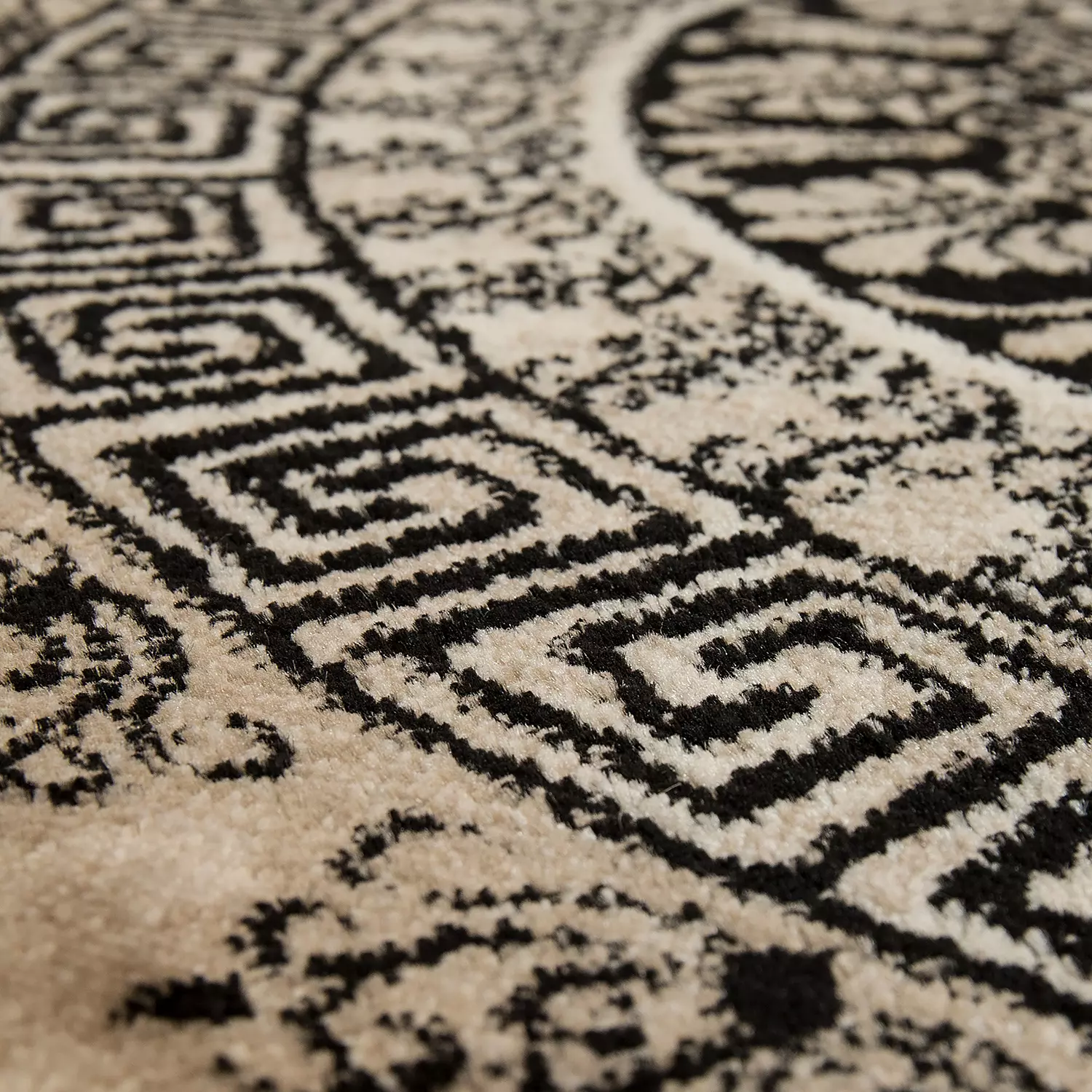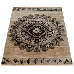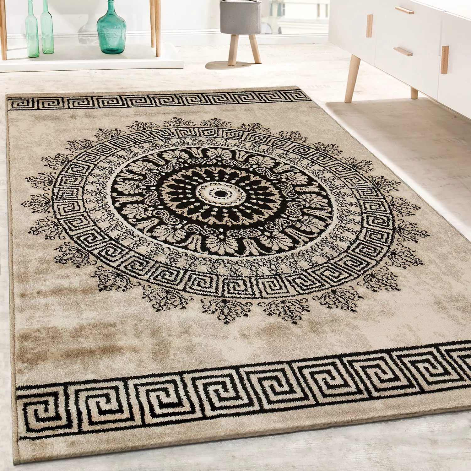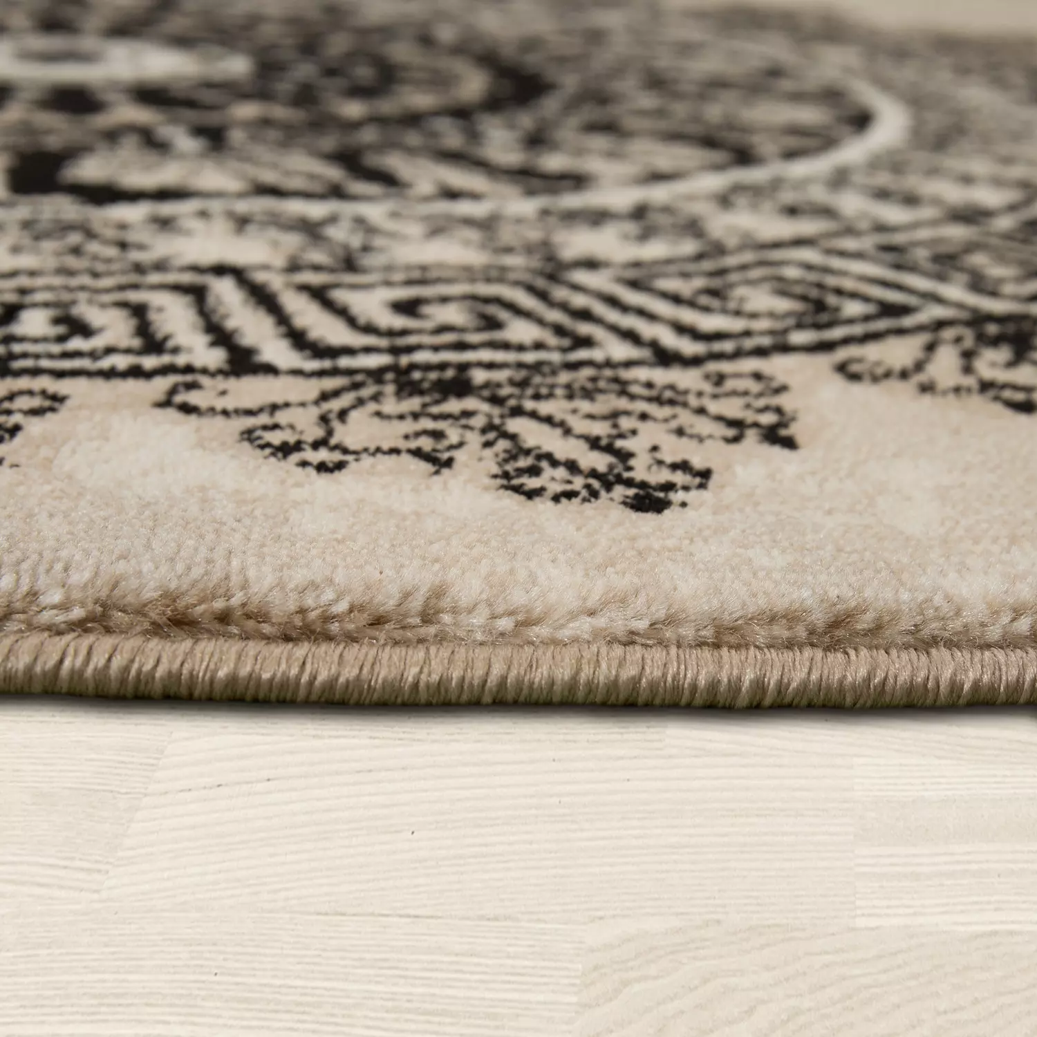 Bei diesem Teppich trifft Tradition auf zeitlos raffiniertes Design! Das Kreismuster mit floralen Elementen und Bordüren in Mäander-Optik ergeben ein traumhaftes Bodenaccessoire, welches in jeder Einrichtung einen repräsentativen Charme entwickelt. Der changierende Hintergrund in Beige erzeugt einen dezenten Used-Look, der das prächtige Mandala-Muster in den Vordergrund stellt. Farbgebung und das orientalische Design verleihen dazu jedem Wohnambiente ein behagliches Flair und spiegeln den guten Geschmack des Besitzers wider. Sie profitieren bei diesem Teppich nicht nur von seinem prachtvollen Auftritt, sondern auch von der strapazierfähigen und pflegeleichten Oberfläche. Die geprüfte Schadstofffreiheit nach dem STANDARD 100 by OEKO-TEX® ist hier ebenso ein Vorteil wie die Eignung für die Fußbodenheizungen. Einrichtungs-Idee: Nehmen Sie die Ornamente dieses Teppichs in Accessoires wie Kissen, Vorhänge oder Lampen wieder auf – so entfaltet er sein ganze Kraft. Da sein prächtiges Design vor allem im Ganzen wirkt, sollte er zentral platziert werden.