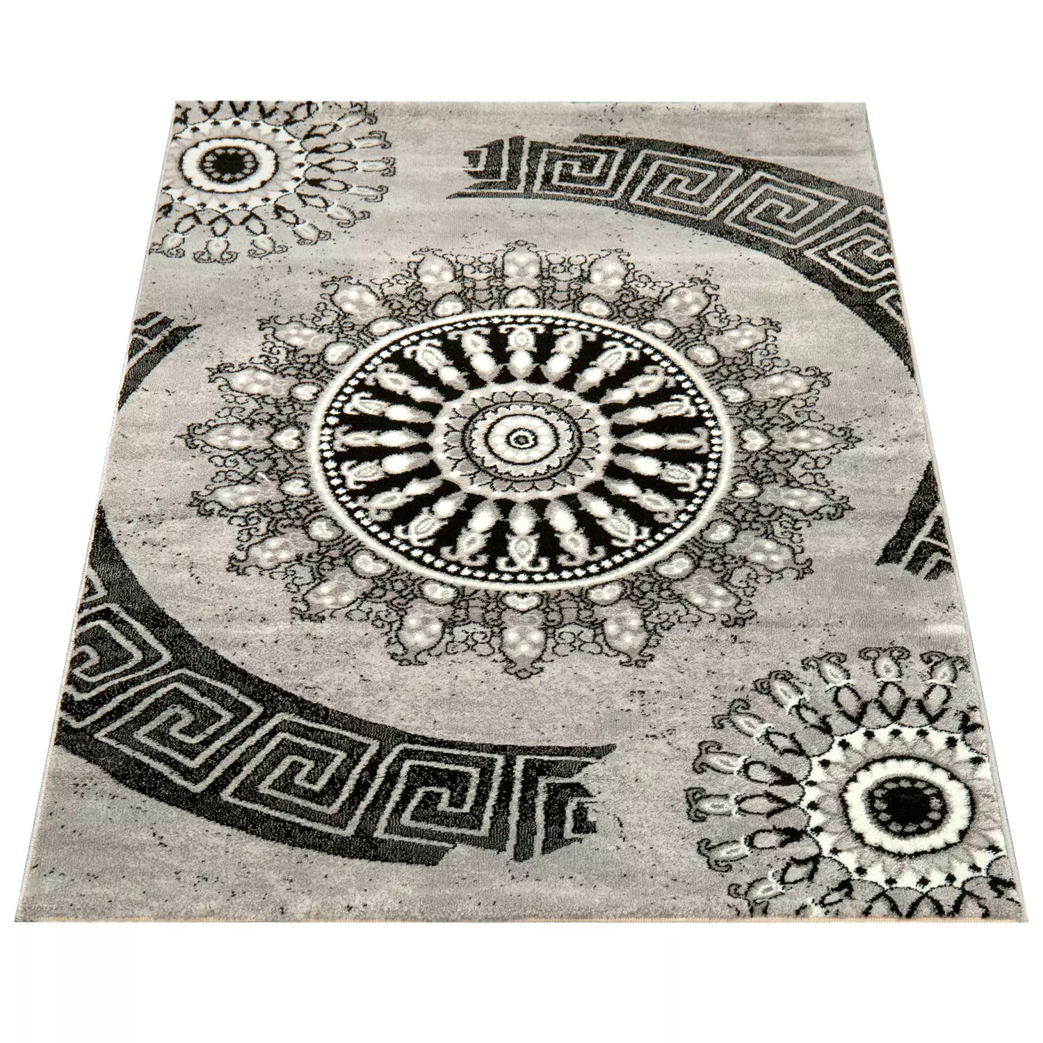 Ein echter Klassiker ist dieser Teppich, der durch prächtigen Ornamente jede Einrichtung verzaubert. Der grau melierte Hintergrund ergibt durch seine Schatten eine einzigartige Dynamik, während die Kreiselemente mit eckigen Bordüren an Originalität kaum zu überbieten sind. Dazu dieser wunderbare Used-Look – wenn Sie die Kombination aus persischem Flair und modernem Auftritt mögen, werden Sie diesen Teppich lieben! Und damit Sie sich nicht um die Belastbarkeit dieses Schmuckstücks sorgen müssen, ist er aus robustem Material gefertigt, welches ihn besonders strapazierfähig und pflegeleicht gestaltet. Im Ergebnis können Sie diesen Allrounder überall da einsetzen, wo Sie einen repräsentativen Bodenbelag wünschen – vom Wohnzimmer über das Büro bis hin zum Flur. Einrichtungs-Idee: Durch seine edel graue Farbgebung wird dieser Teppich gerne als Kontrastpunkt in modernen Wohnlandschaften eingesetzt. Als Ergänzung zum orientalischen Flair wären zum Beispiel opulente Sitzgelegenheiten oder ein gläserner Kronleuchter denkbar.