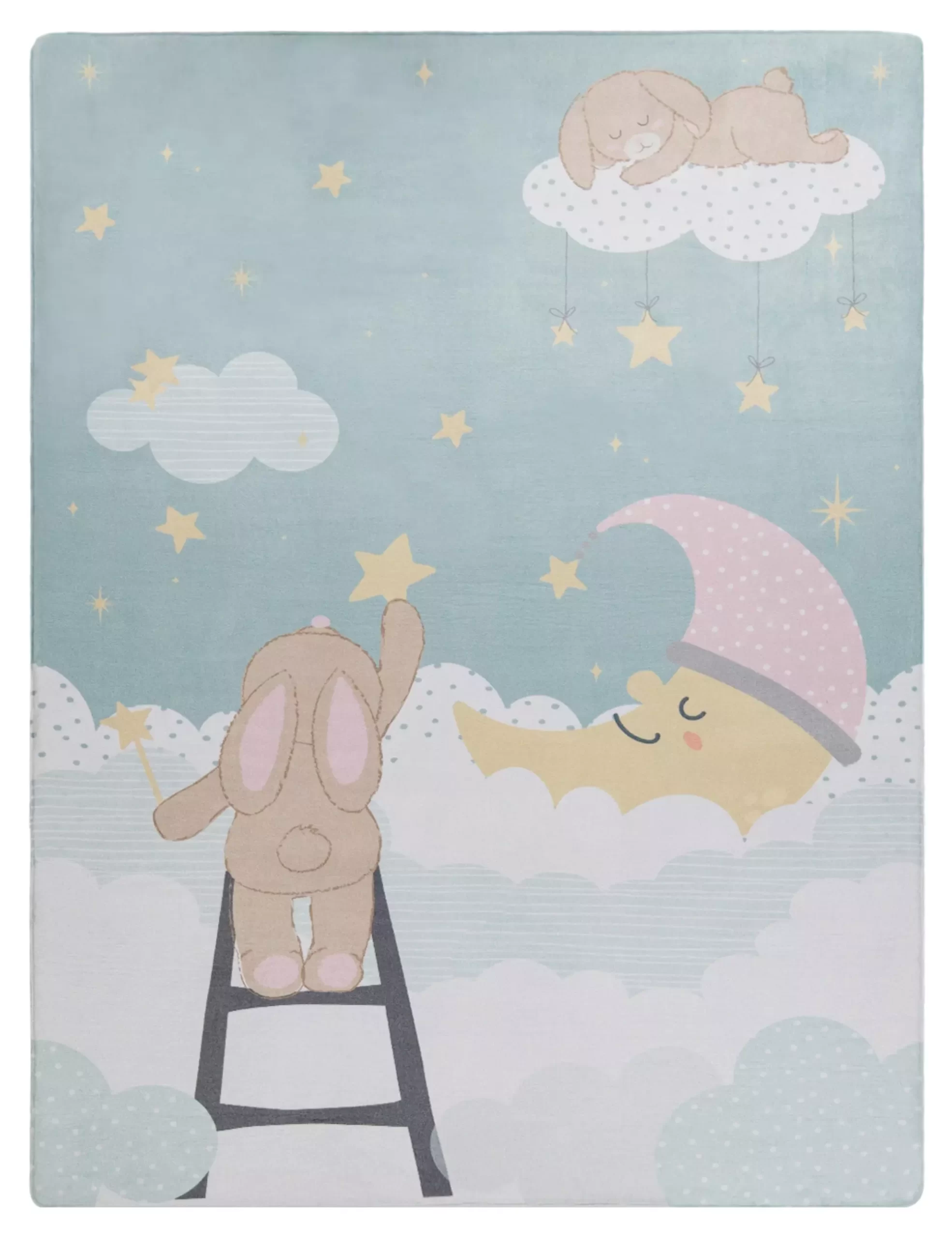 Sind die Kleinen mal wieder störrisch und wollen auf Gedeih und Verderb nicht ins Bett? Diese schönen Kinderteppiche machen das ansonsten so stressige Schlafengehen im wahrsten Sinne des Wortes zum Kinderspiel. Die süßen Farben und das traumhaft putzige Motiv mit müdem Mond und den fürsorglichen Hasen bringen Friede und Idylle in das turbulente Kinderzimmer und werden im Handumdrehen zu regelmäßigen Begleitern auf den Traumreisen Ihrer Kleinen. So gönnen Sie Ihren Kindern und gleichzeitig sich selbst die Extraportion Entspannung.